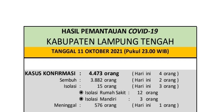 Download dokumen : HASIL PEMANTAUAN COVID-19 KABUPATEN LAMPUNG TENGAH : Tanggal 11 Oktober 2021 Pukul 23.00 WIB