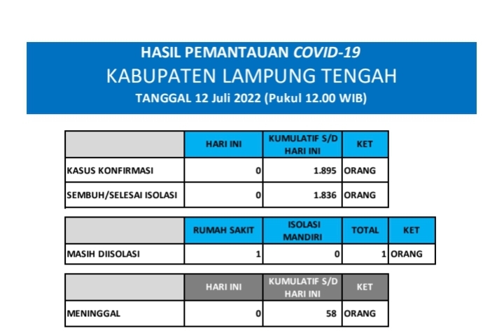 HASIL PEMANTAUAN COVID-19 KABUPATEN LAMPUNG TENGAH : Tanggal 12 Juli 2022