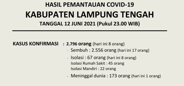 Download dokumen : HASIL PEMANTAUAN COVID-19 KABUPATEN LAMPUNG TENGAH : Tanggal 12 Juni 2021 Pukul 23.00 WIB
