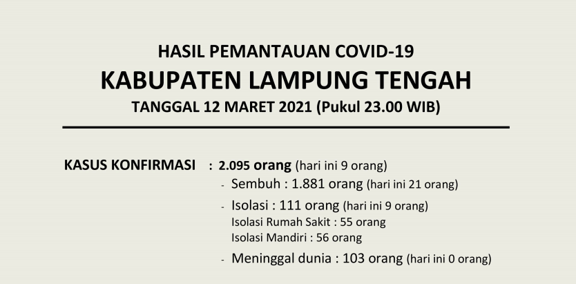 HASIL PEMANTAUAN COVID-19 KABUPATEN LAMPUNG TENGAH TANGGAL 12 MARET 2021 PUKUL 23.00 WIB