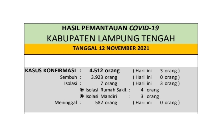 HASIL PEMANTAUAN COVID-19 KABUPATEN LAMPUNG TENGAH : Tanggal 12 November 2021