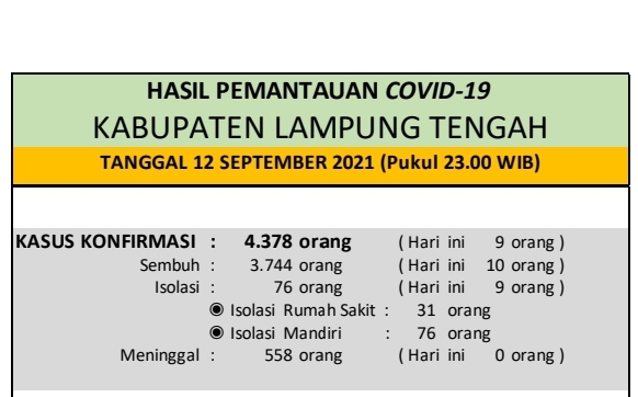 Download dokumen : HASIL PEMANTAUAN COVID-19 KABUPATEN LAMPUNG TENGAH : Tanggal 12 September 2021 Pukul 23.00 WIB