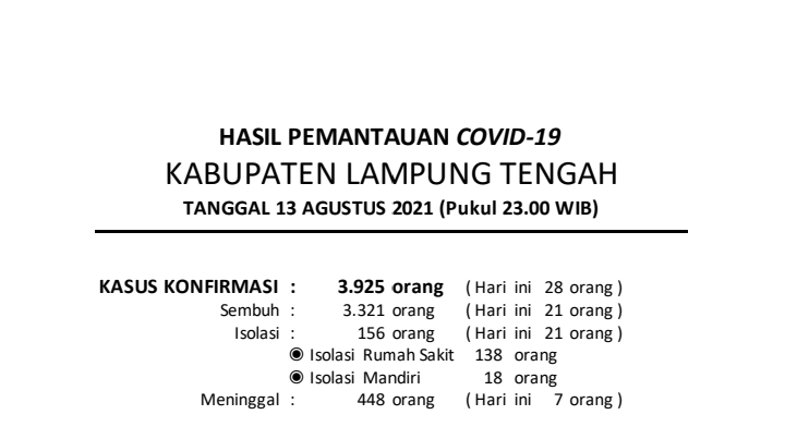 Download dokumen : HASIL PEMANTAUAN COVID-19 KABUPATEN LAMPUNG TENGAH : Tanggal 13 Agustus 2021 Pukul 23.00 WIB