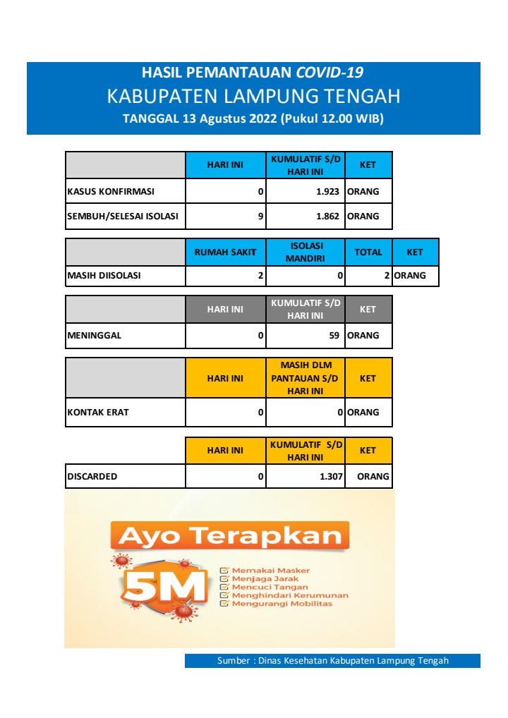 HASIL PEMANTAUAN COVID-19 KABUPATEN LAMPUNG TENGAH : Tanggal 13 Agustus 2022
