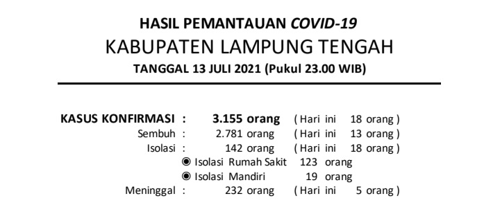 Download dokumen : HASIL PEMANTAUAN COVID-19 KABUPATEN LAMPUNG TENGAH : Tanggal 13 Juli 2021 Pukul 23.00 WIB