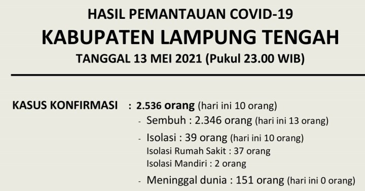 Download dokumen : HASIL PEMANTAUAN COVID-19 KABUPATEN LAMPUNG TENGAH : Tanggal 13 Mei 2021 Pukul 23.00 WIB