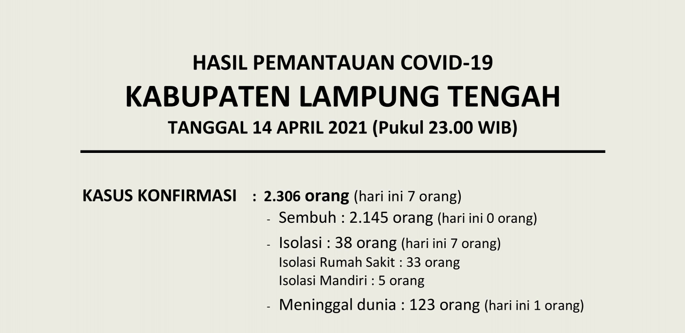 HASIL PEMANTAUAN COVID-19 KABUPATEN LAMPUNG TENGAH : Tanggal 14 April 2021 Pukul 23.00 WIB