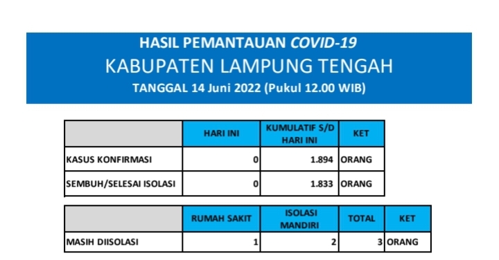 HASIL PEMANTAUAN COVID-19 KABUPATEN LAMPUNG TENGAH : Tanggal 14 Juni 2022