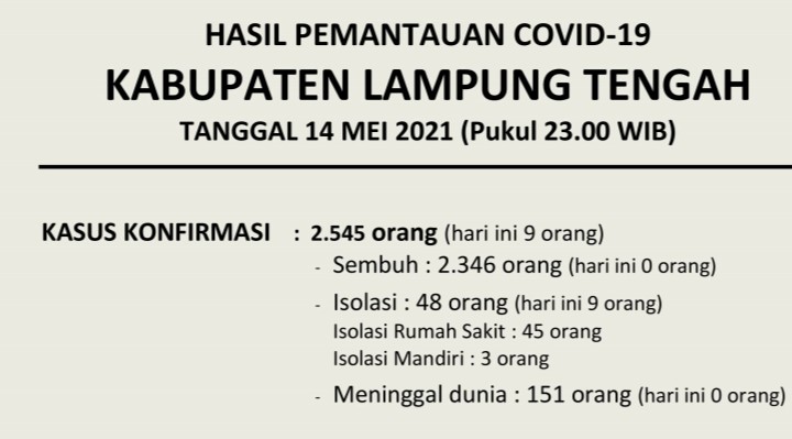 Download dokumen : HASIL PEMANTAUAN COVID-19 KABUPATEN LAMPUNG TENGAH : Tanggal 14 Mei 2021 Pukul 23.00 WIB