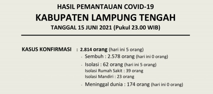 Download dokumen : HASIL PEMANTAUAN COVID-19 KABUPATEN LAMPUNG TENGAH : Tanggal 15 Juni 2021 Pukul 23.00 WIB
