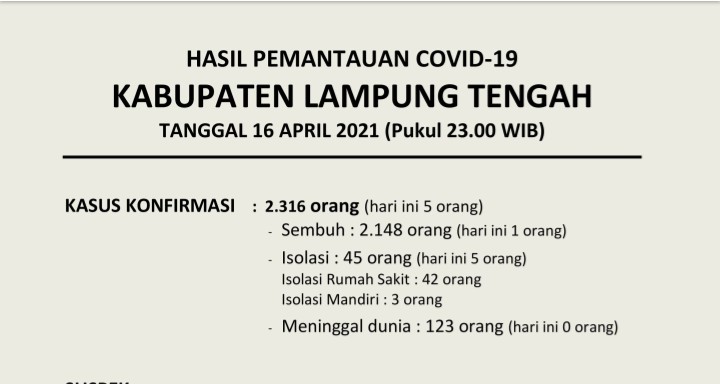 HASIL PEMANTAUAN COVID-19 KABUPATEN LAMPUNG TENGAH : Tanggal 16 April 2021 Pukul 23.00 WIB