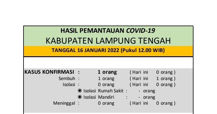 HASIL PEMANTAUAN COVID-19 KABUPATEN LAMPUNG TENGAH : Tanggal 16 Januari 2022