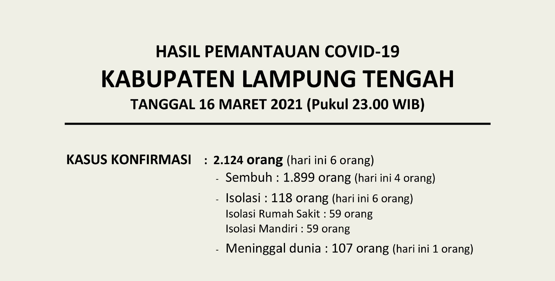 HASIL PEMANTAUAN COVID-19 KABUPATEN LAMPUNG TENGAH TANGGAL 16 MARET 2021 PUKUL 23.00 WIB
