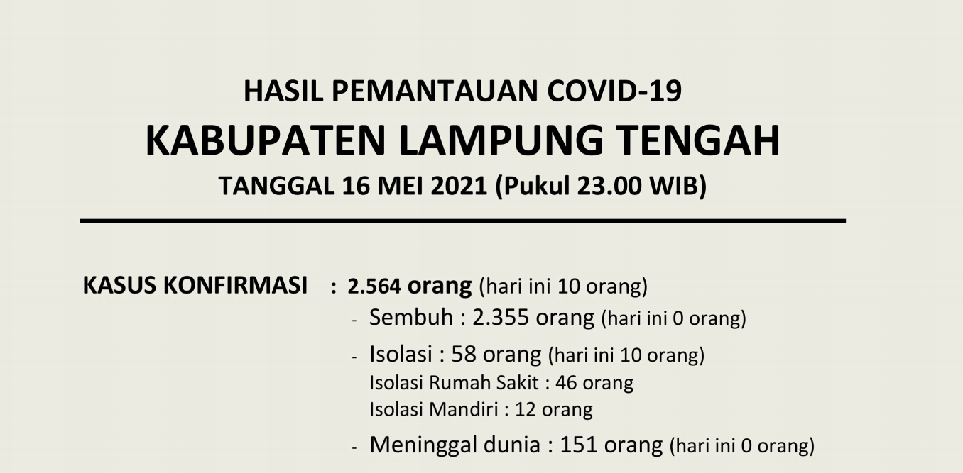 HASIL PEMANTAUAN COVID-19 KABUPATEN LAMPUNG TENGAH : Tanggal 16 Mei 2021 Pukul 23.00 WIB