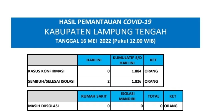 HASIL PEMANTAUAN COVID-19 KABUPATEN LAMPUNG TENGAH : Tanggal 16 Mei 2022