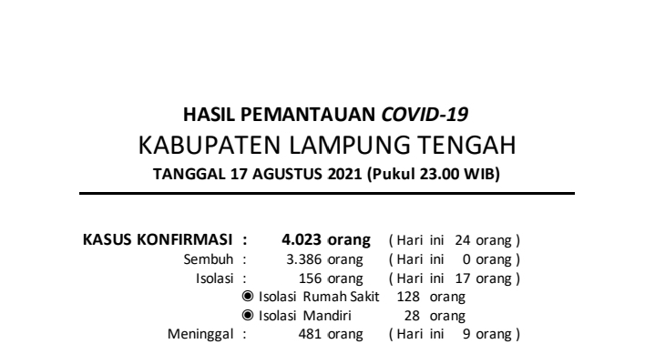 Download dokumen : HASIL PEMANTAUAN COVID-19 KABUPATEN LAMPUNG TENGAH : Tanggal 17 Agustus 2021 Pukul 23.00 WIB