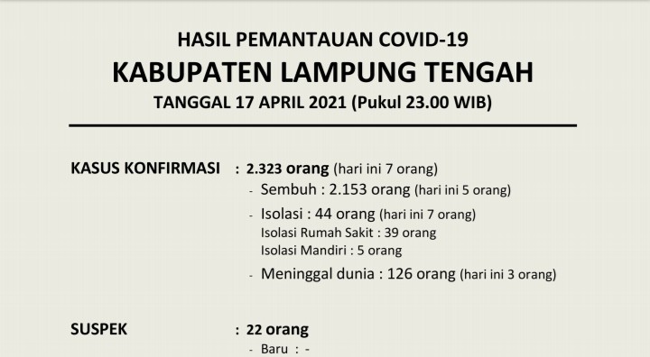 Download dokumen : HASIL PEMANTAUAN COVID-19 KABUPATEN LAMPUNG TENGAH : Tanggal 17 April 2021 Pukul 23.00 WIB