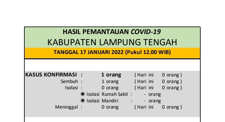 HASIL PEMANTAUAN COVID-19 KABUPATEN LAMPUNG TENGAH : Tanggal 17 Januari 2022