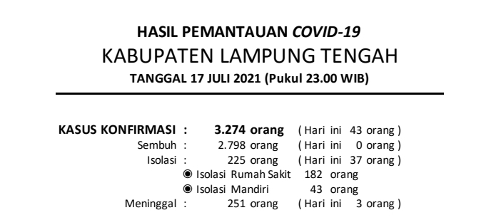HASIL PEMANTAUAN COVID-19 KABUPATEN LAMPUNG TENGAH : Tanggal 17 Juli 2021 Pukul 23.00 WIB