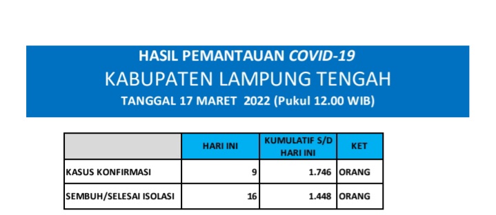 HASIL PEMANTAUAN COVID-19 KABUPATEN LAMPUNG TENGAH : Tanggal 17 Maret 2022