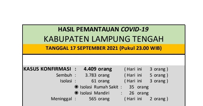 Download dokumen : HASIL PEMANTAUAN COVID-19 KABUPATEN LAMPUNG TENGAH : Tanggal 17 September 2021 Pukul 23.00 WIB