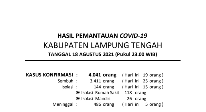 Download dokumen : HASIL PEMANTAUAN COVID-19 KABUPATEN LAMPUNG TENGAH : Tanggal 18 Agustus 2021 Pukul 23.00 WIB