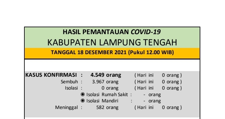 HASIL PEMANTAUAN COVID-19 KABUPATEN LAMPUNG TENGAH : Tanggal 18 Desember 2021 (Sampai dengan pukul 12.00 WIB)