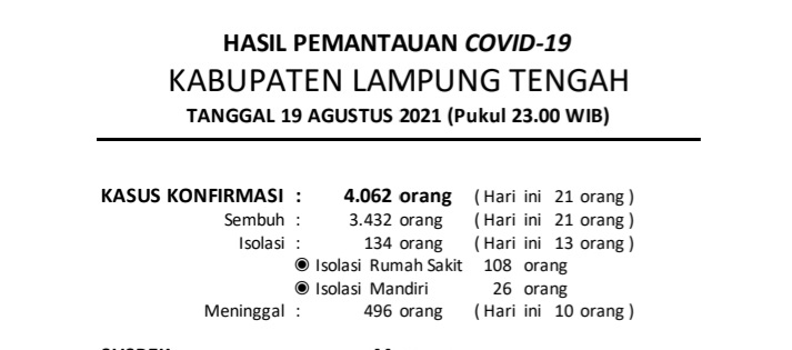 Download dokumen : HASIL PEMANTAUAN COVID-19 KABUPATEN LAMPUNG TENGAH : Tanggal 19 Agustus 2021 Pukul 23.00 WIB