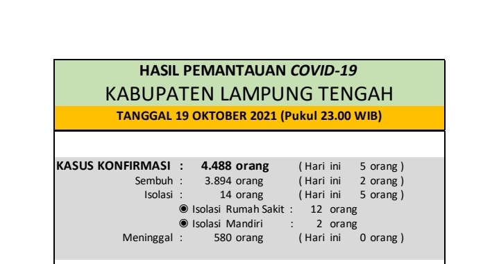 Download dokumen HASIL PEMANTAUAN COVID-19 KABUPATEN LAMPUNG TENGAH : Tanggal 19 Oktober 2021 Pukul 23.00 WIB