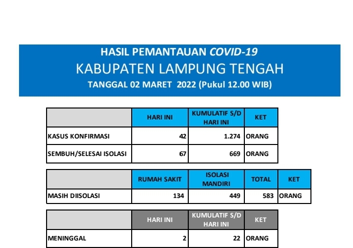 HASIL PEMANTAUAN COVID-19 KABUPATEN LAMPUNG TENGAH : Tanggal 2 Maret 2022