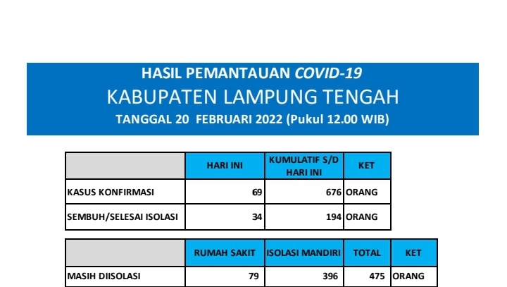 HASIL PEMANTAUAN COVID-19 KABUPATEN LAMPUNG TENGAH : Tanggal 20 Februari 2022