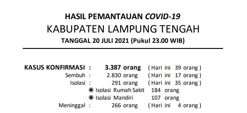 Download dokumen : HASIL PEMANTAUAN COVID-19 KABUPATEN LAMPUNG TENGAH : Tanggal 20 Juli 2021 Pukul 23.00 WIB