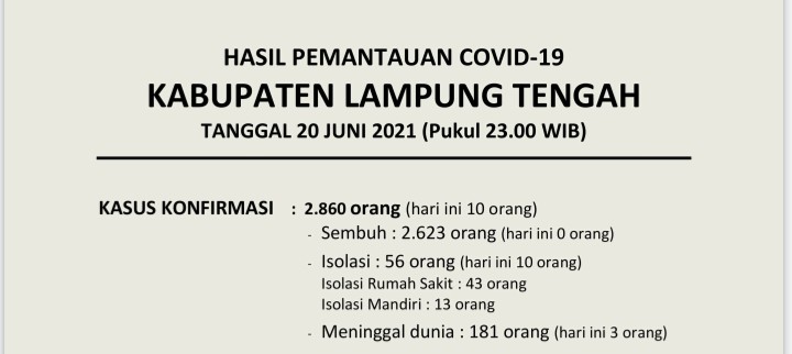 Download dokumen : HASIL PEMANTAUAN COVID-19 KABUPATEN LAMPUNG TENGAH : Tanggal 20 Juni 2021 Pukul 23.00 WIB