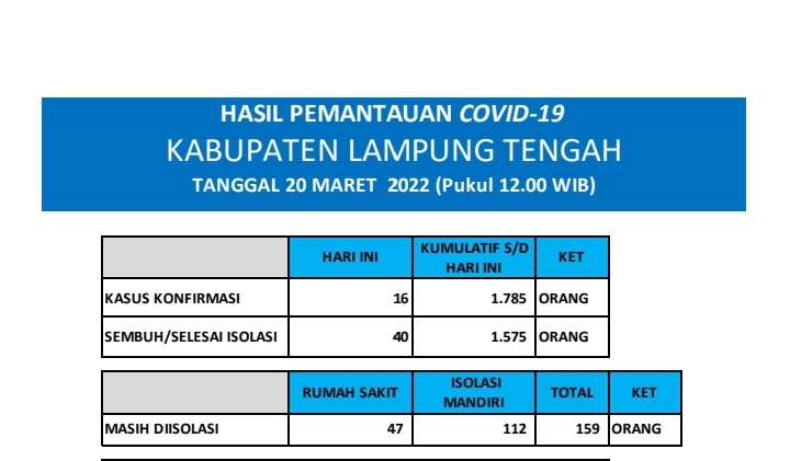 HASIL PEMANTAUAN COVID-19 KABUPATEN LAMPUNG TENGAH : Tanggal 20 Maret 2022