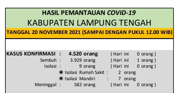 Download dokumen HASIL PEMANTAUAN COVID-19 KABUPATEN LAMPUNG TENGAH : Tanggal 20 November 2021 (Sampai dengan pukul 12.00 WIB)