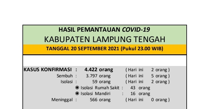 Download dokumen : HASIL PEMANTAUAN COVID-19 KABUPATEN LAMPUNG TENGAH : Tanggal 20 September 2021 Pukul 23.00 WIB