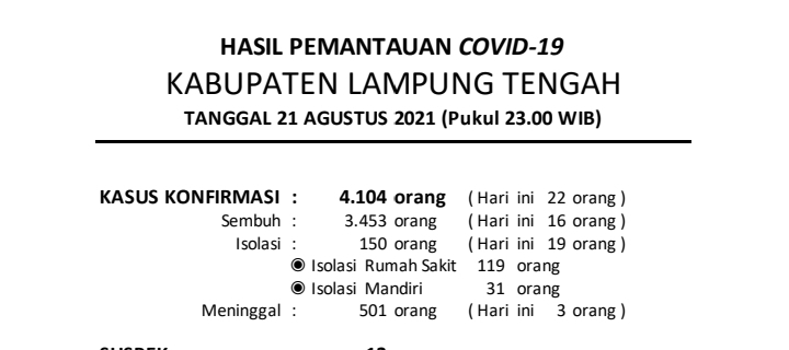 Download dokumen : HASIL PEMANTAUAN COVID-19 KABUPATEN LAMPUNG TENGAH : Tanggal 21 Agustus 2021 Pukul 23.00 WIB