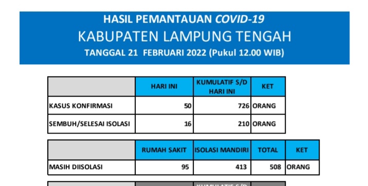 HASIL PEMANTAUAN COVID-19 KABUPATEN LAMPUNG TENGAH : Tanggal 21 Februari 2022