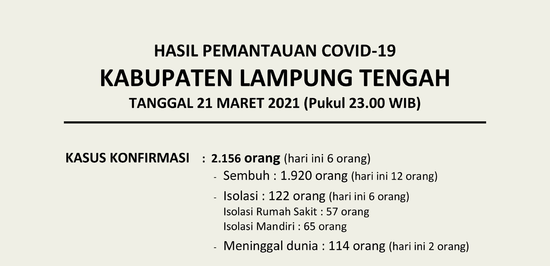 HASIL PEMANTAUAN COVID-19 KABUPATEN LAMPUNG TENGAH : Tanggal 21 Maret 2021 Pukul 23.00 WIB