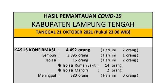 Download dokumen : HASIL PEMANTAUAN COVID-19 KABUPATEN LAMPUNG TENGAH : Tanggal 21 Oktober 2021 Pukul 23.00 WIB