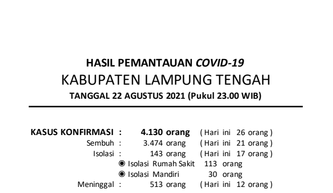 Download dokumen : HASIL PEMANTAUAN COVID-19 KABUPATEN LAMPUNG TENGAH : Tanggal 22 Agustus 2021 Pukul 23.00 WIB