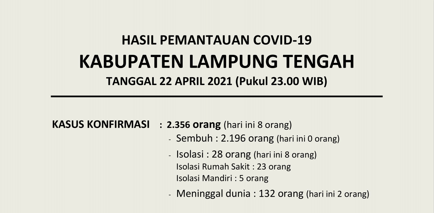 HASIL PEMANTAUAN COVID-19 KABUPATEN LAMPUNG TENGAH : Tanggal 22 April 2021 Pukul 23.00 WIB