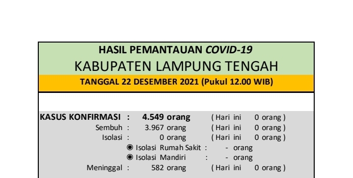 HASIL PEMANTAUAN COVID-19 KABUPATEN LAMPUNG TENGAH : Tanggal 22 Desember 2021 (Sampai dengan pukul 12.00 WIB)