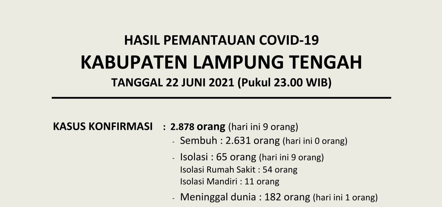 Download dokumen : HASIL PEMANTAUAN COVID-19 KABUPATEN LAMPUNG TENGAH : Tanggal 22 Juni 2021 Pukul 23.00 WIB