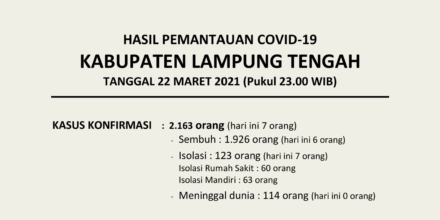 HASIL PEMANTAUAN COVID-19 KABUPATEN LAMPUNG TENGAH : Tanggal 22 Maret 2021 Pukul 23.00 WIB