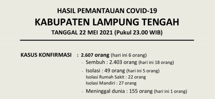 Download dokumen : HASIL PEMANTAUAN COVID-19 KABUPATEN LAMPUNG TENGAH : Tanggal 22 Mei 2021 Pukul 23.00 WIB