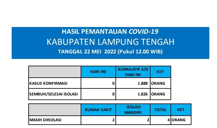 HASIL PEMANTAUAN COVID-19 KABUPATEN LAMPUNG TENGAH : Tanggal 22 Mei 2022