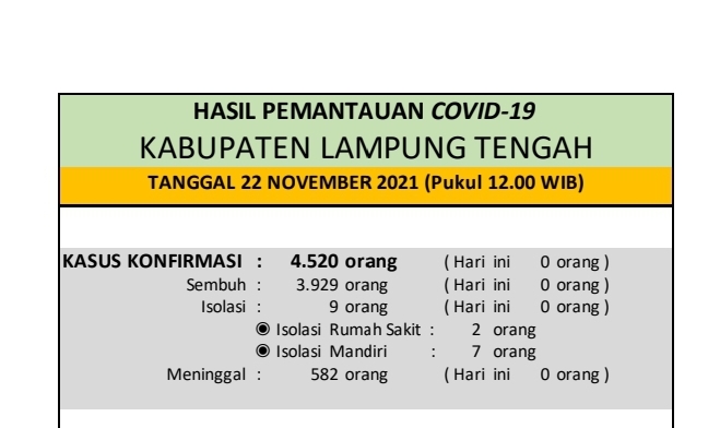 Download dokumen HASIL PEMANTAUAN COVID-19 KABUPATEN LAMPUNG TENGAH : Tanggal 22 November 2021 (Sampai dengan pukul 12.00 WIB)