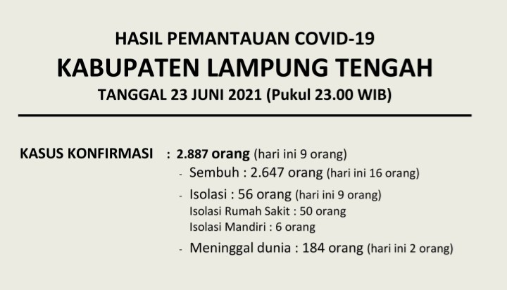 Download dokumen : HASIL PEMANTAUAN COVID-19 KABUPATEN LAMPUNG TENGAH : Tanggal 23 Juni 2021 Pukul 23.00 WIB