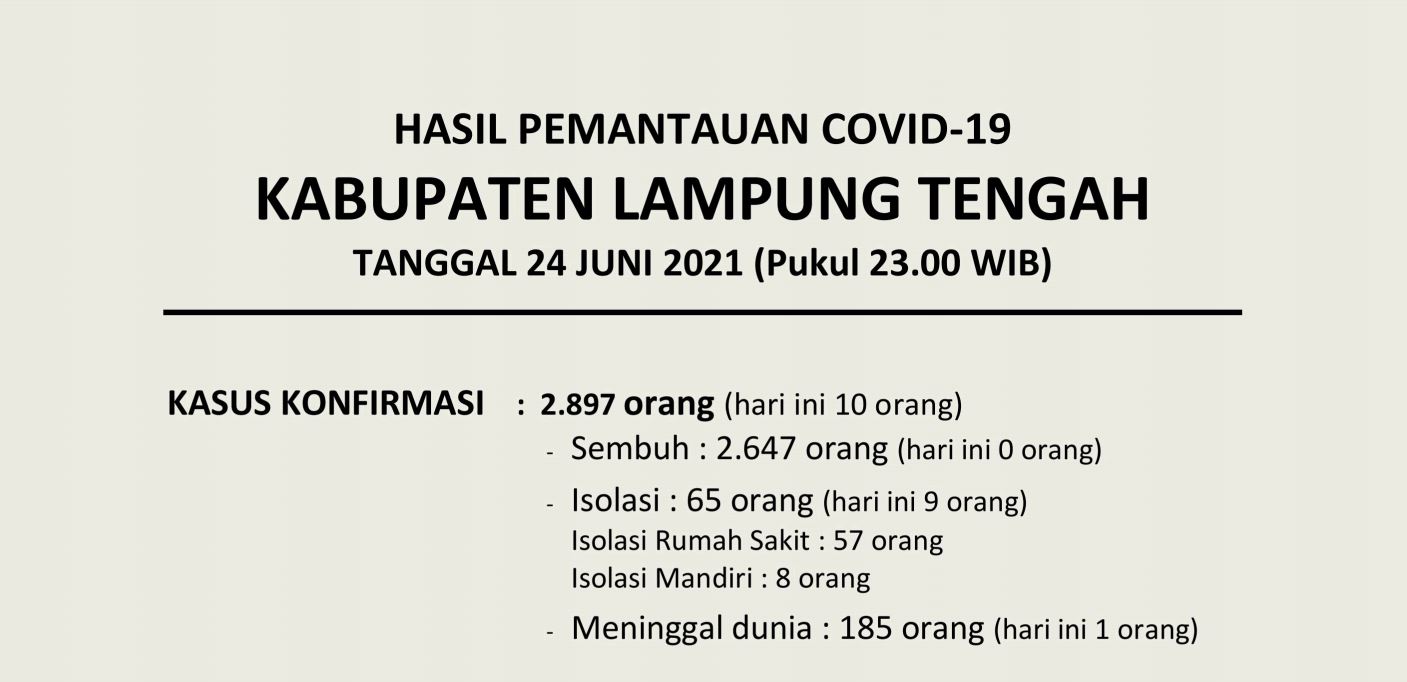 Download dokumen : HASIL PEMANTAUAN COVID-19 KABUPATEN LAMPUNG TENGAH : Tanggal 24 Juni 2021 Pukul 23.00 WIB